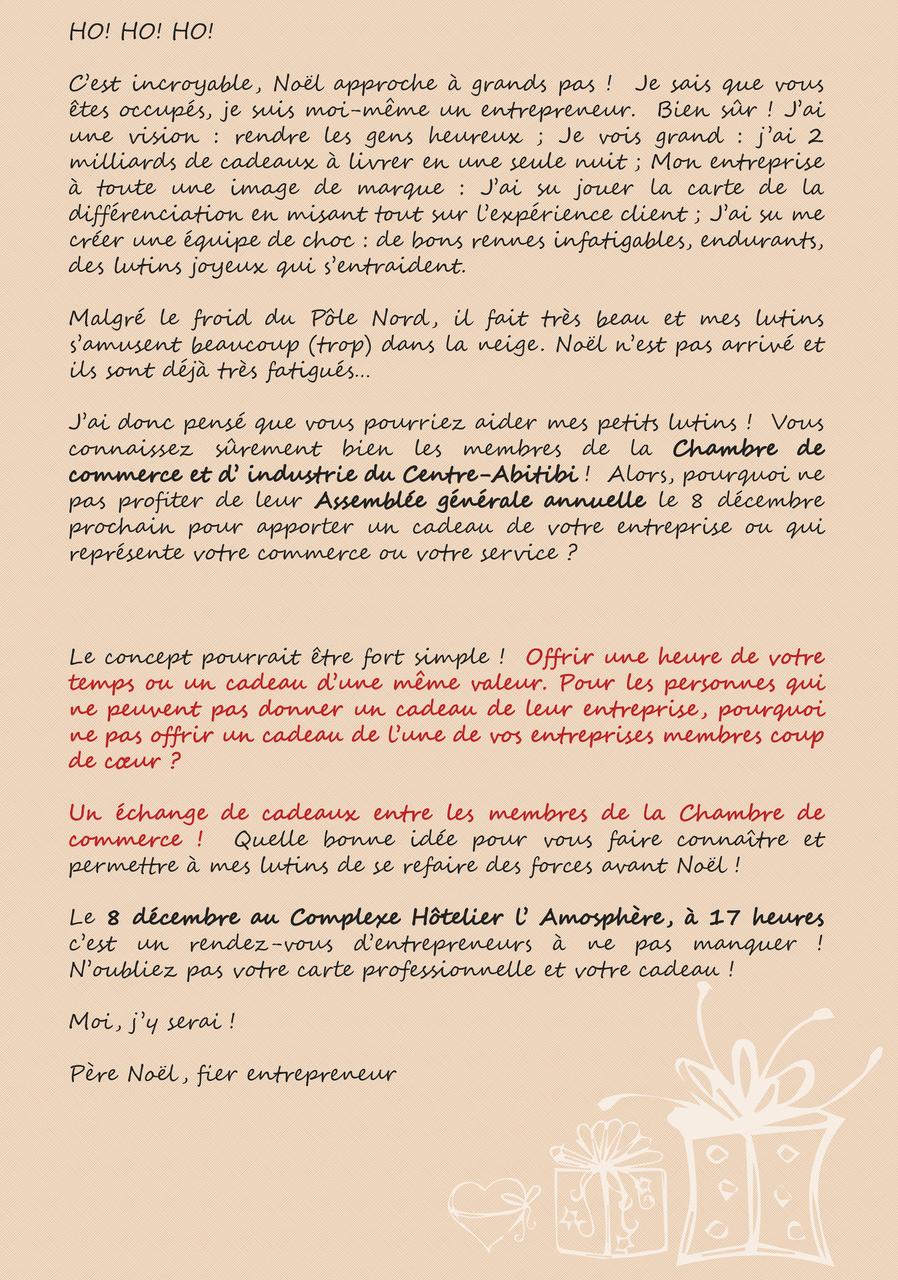 Veuillez confirmer votre présence avant le 1er décembre à info@ccica.ca ou par téléphone au 819 732-8100. Un échange de cadeaux entre membres est aussi prévu lors de soirée. Pour plus de détails, cliquez sur la lettre du père Noël!