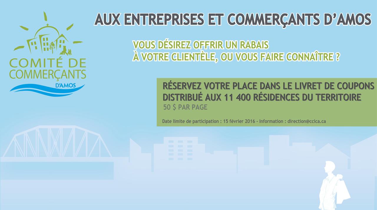 Le comité des commerçants de la Ville d'Amos nouvellement créé, vous offre la possibilité de proposer des rabais à votre clientèle et de vous faire connaître dans un livret de coupons qui sera distribué par la poste à 11 400 foyers du territoire. Le coût est de 50 $ par page. Vous avez jusqu'au 15 février pour participer à cette offre! Ne la manquez pas! Information et réservation : direction@ccica.ca ou 819 732-8100. La Chambre de commerce et d'industrie du Centre-Abitibi et la Ville d'Amos sont partenaires du comité des commerçants qui proposera des activités d'animation et de promotion au cours de l'année. Consultez régulièrement leur page Facebook!