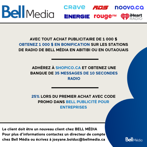 Avec tout achat publicitaire de 1000$ et plus sur une propriété de BELL MÉDIA, obtenez 1000$ de PUBLICITÉ radio supplémentaire.