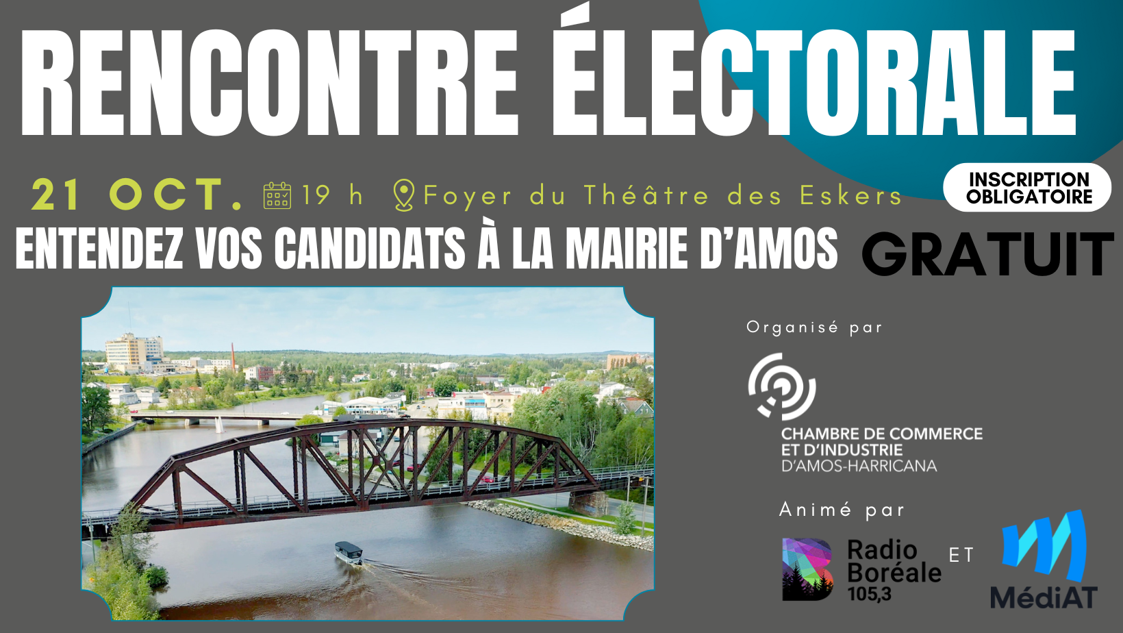 La Chambre de commerce et d’industrie d’Amos-Harricana convie la population et la communauté d’affaires à une rencontre électorale entre les candidats à la mairie d'Amos.